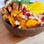 - Ajouter quelques cubes de giraumon et rondelles de banane sur un côté et poursuivre de la même façon avec la mangue, grenade et épinards.