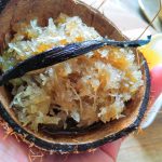Une délicieuse confiture, que l’on pourrai plutôt qualifier de « confit » de coco de par l’aspect et la texture obtenue. On l’utilise pour garnir les tourment d’amour, les pâtés sucrés, le gros gâteau coco par exemple. Mais elle est toute aussi est savoureuse juste accompagnée d’un morceau de pain… Pour bien choisir votre noix de coco, secouez la, elle doit contenir un peu de liquide encore