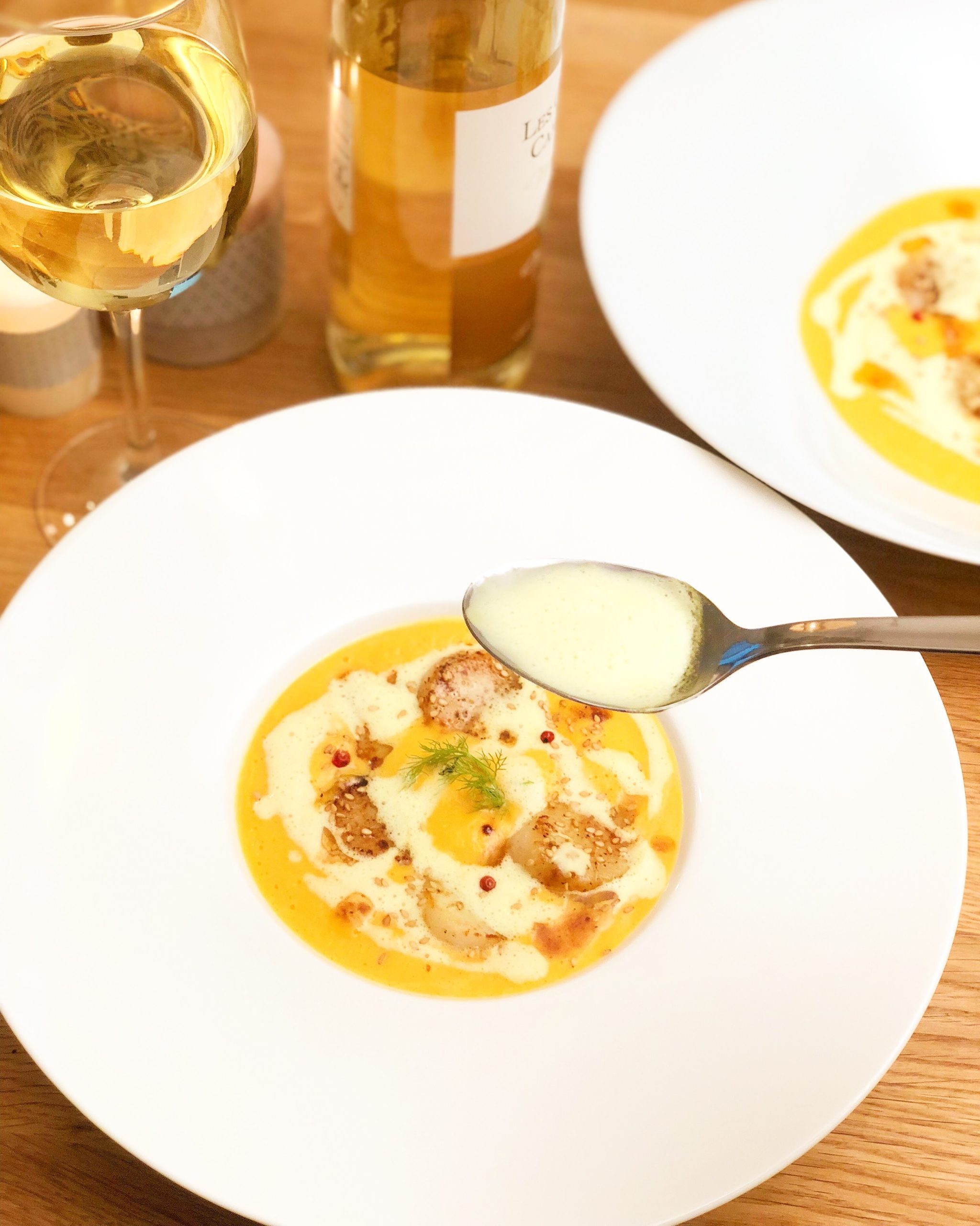 Crémeux de courge à la vanille, noix de st-jacques & émulsion coco, gingembre-curcuma