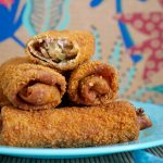 - Enrober chaque crêpe garnie dans le bol d’oeuf battu et enfin dans la chapelure. Faire fire les crêpes dans un bain d’huile jusqu’à ce qu’elles soient bien dorées. Égoutter sur du papier absorbant.