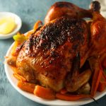 - Enfourner à nouveau pour 1h de cuisson à 200° en arrosant régulièrement le poulet.